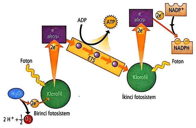 Tilakoid üzerinde: ışık soğurulması → ETS → ATP/NADPH oluşumu → suyun fotolizi ve O₂