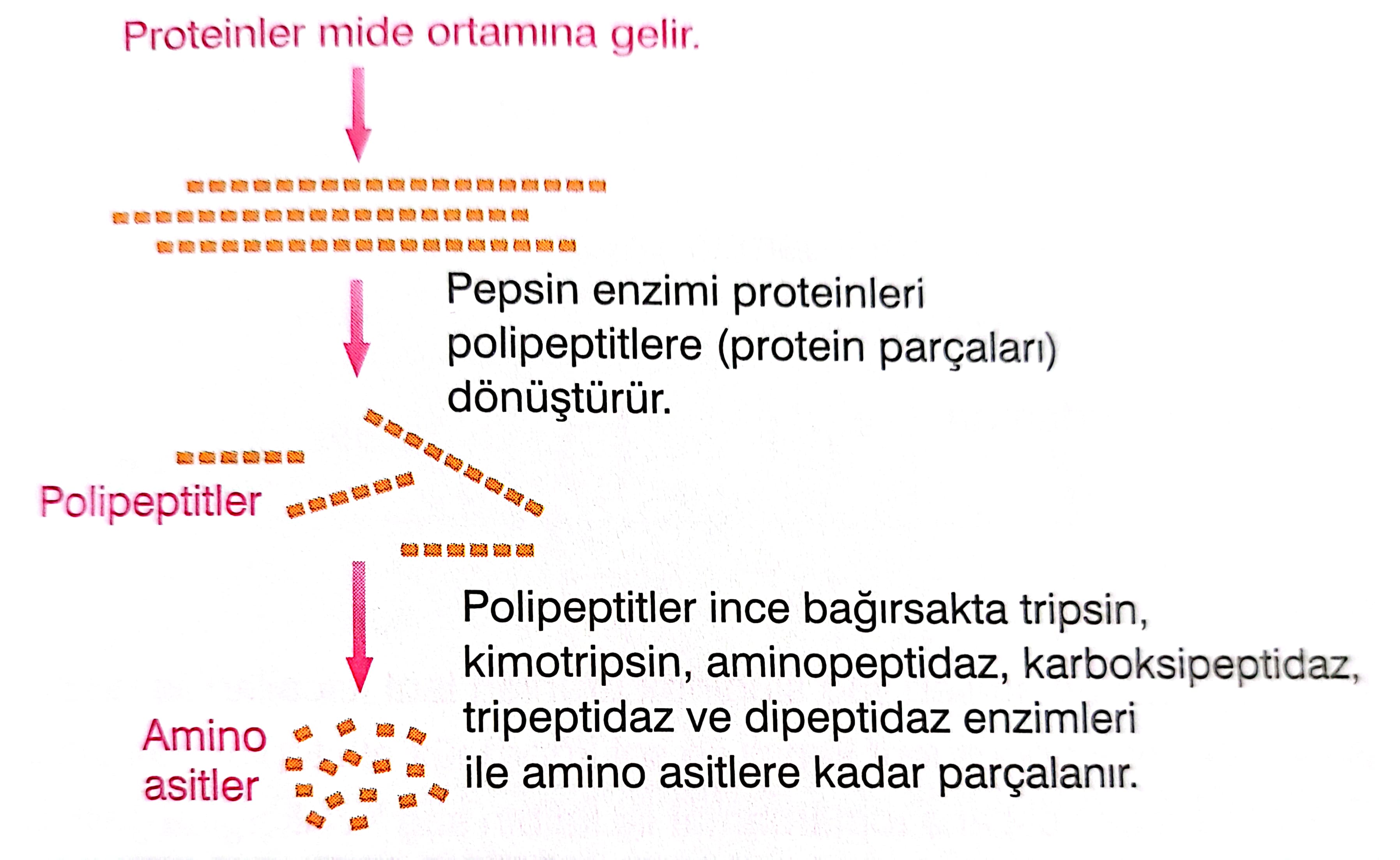 ► İnce bağırsak epitelinden salgılanan aminopeptidaz ve dipeptidaz enzimleri ile pankreastan ve ince bağırsak epitelinden salgılanan kaboksipeptidaz küçük polipeptitleri amino asitlere parçalar.