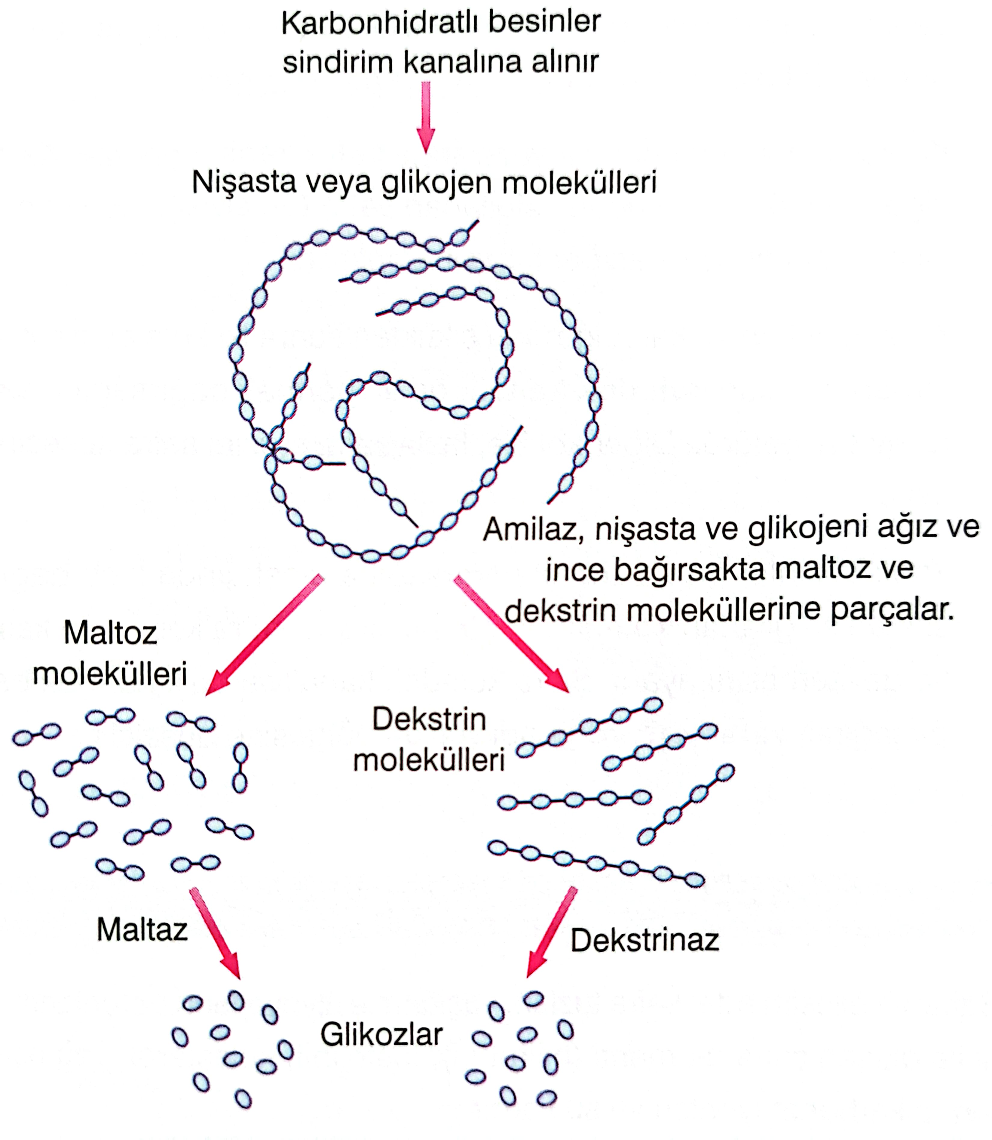 ► Pankreastan salgılanan amilaz enzimi nişasta ve glikojeni oniki parmak bağırsağında maltoz ve dekstrinlere parçalar.