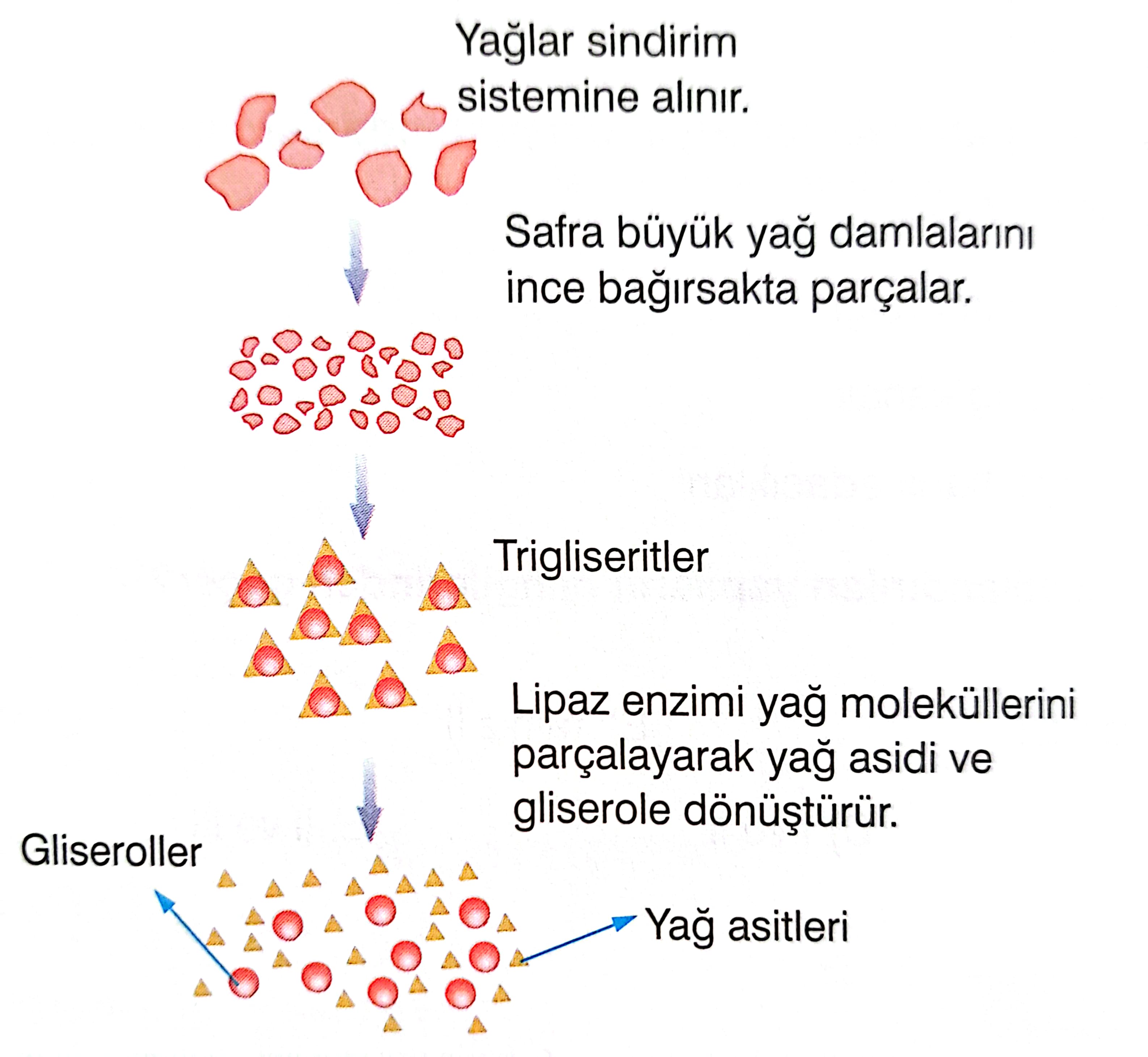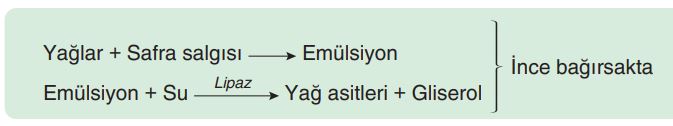Ağız ve midede yağların kimyasal sindirimi olmaz. Sindirim ince bağırsakta başlar ve tamamlanır.