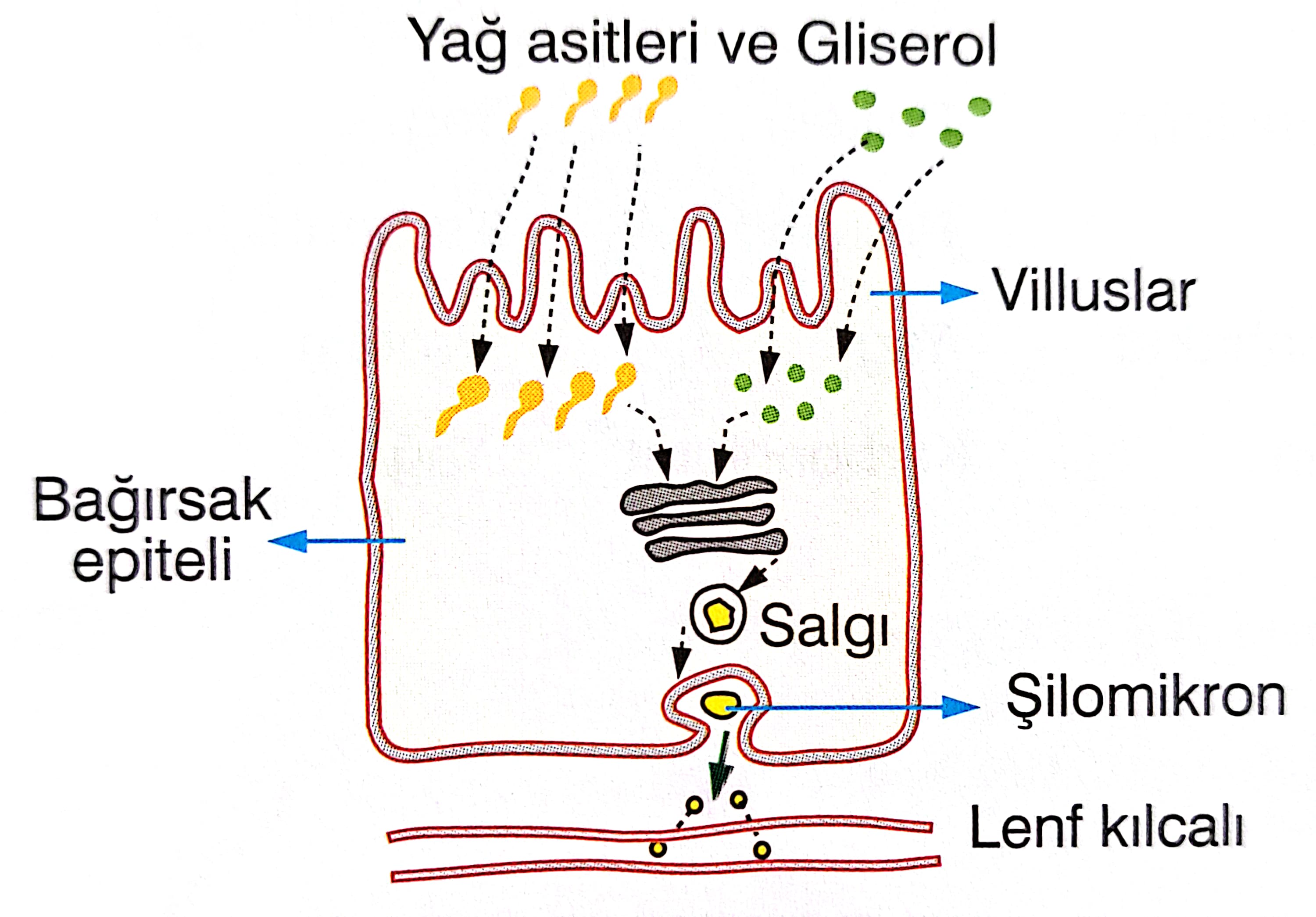 ► Şilomikron halindeki yağ molekülleri epitel hücrelerinden ekzositoz ile lenf kılcallarına geçer sonra büyük lenf toplardamarlarından olan peke sarnıcı ile göğüs kanalına taşınırlar.