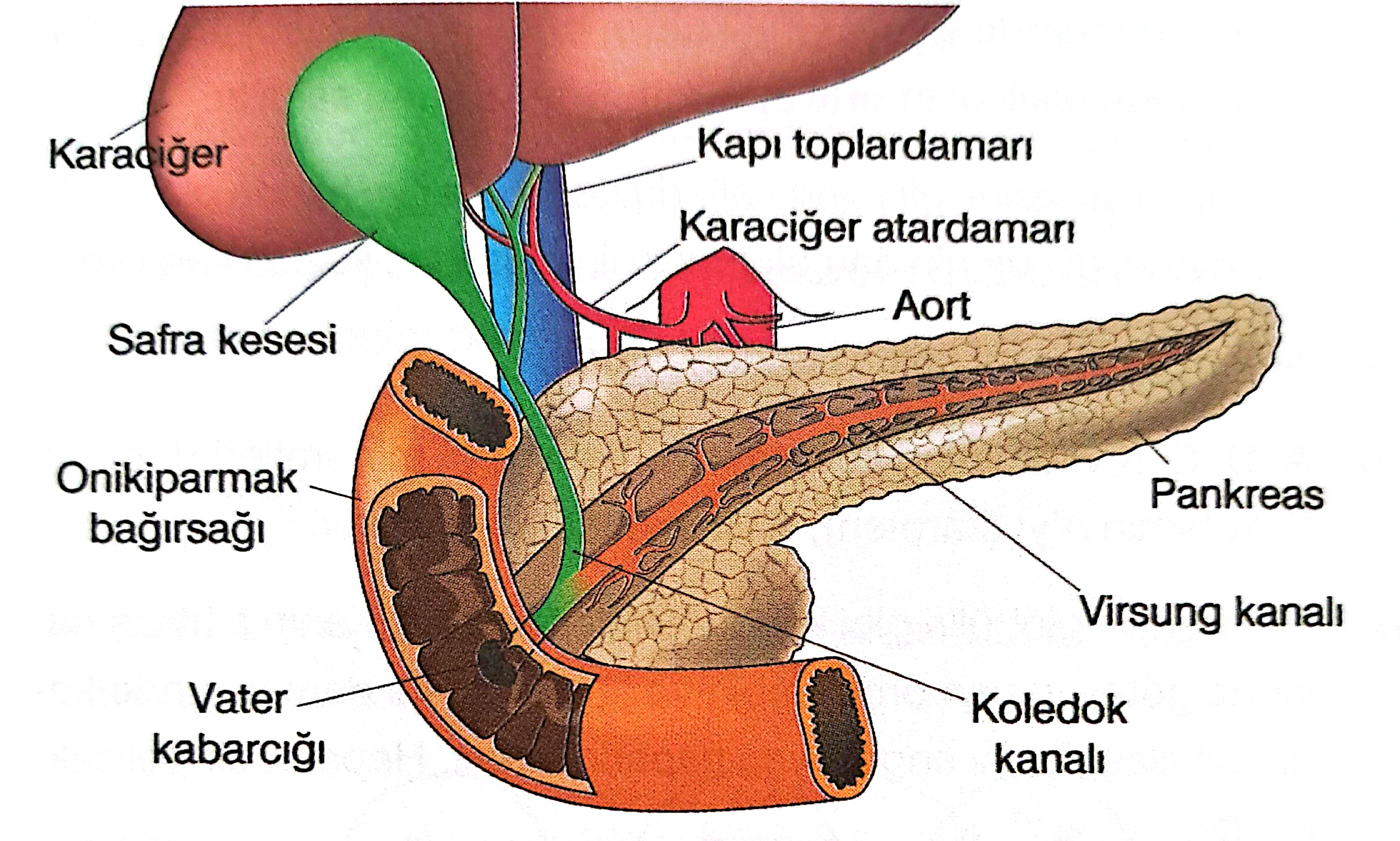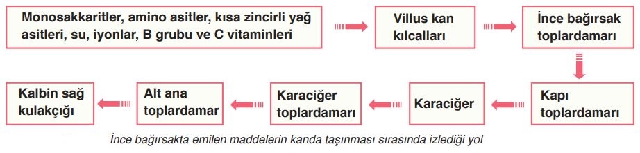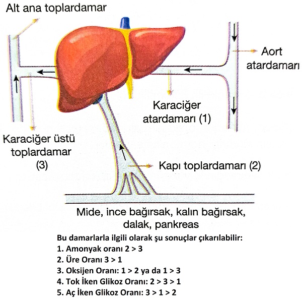 ► Bu besinler kapı toplardamarıyla karaciğere taşınır. Karaciğerde gerekli düzenlemeler yapıldıktan sonra, karaciğer toplardamarıyla alt ana toplardamara taşınır ve sonra kalbe getirilir. Buradan bütün vücuda dağıtılır.