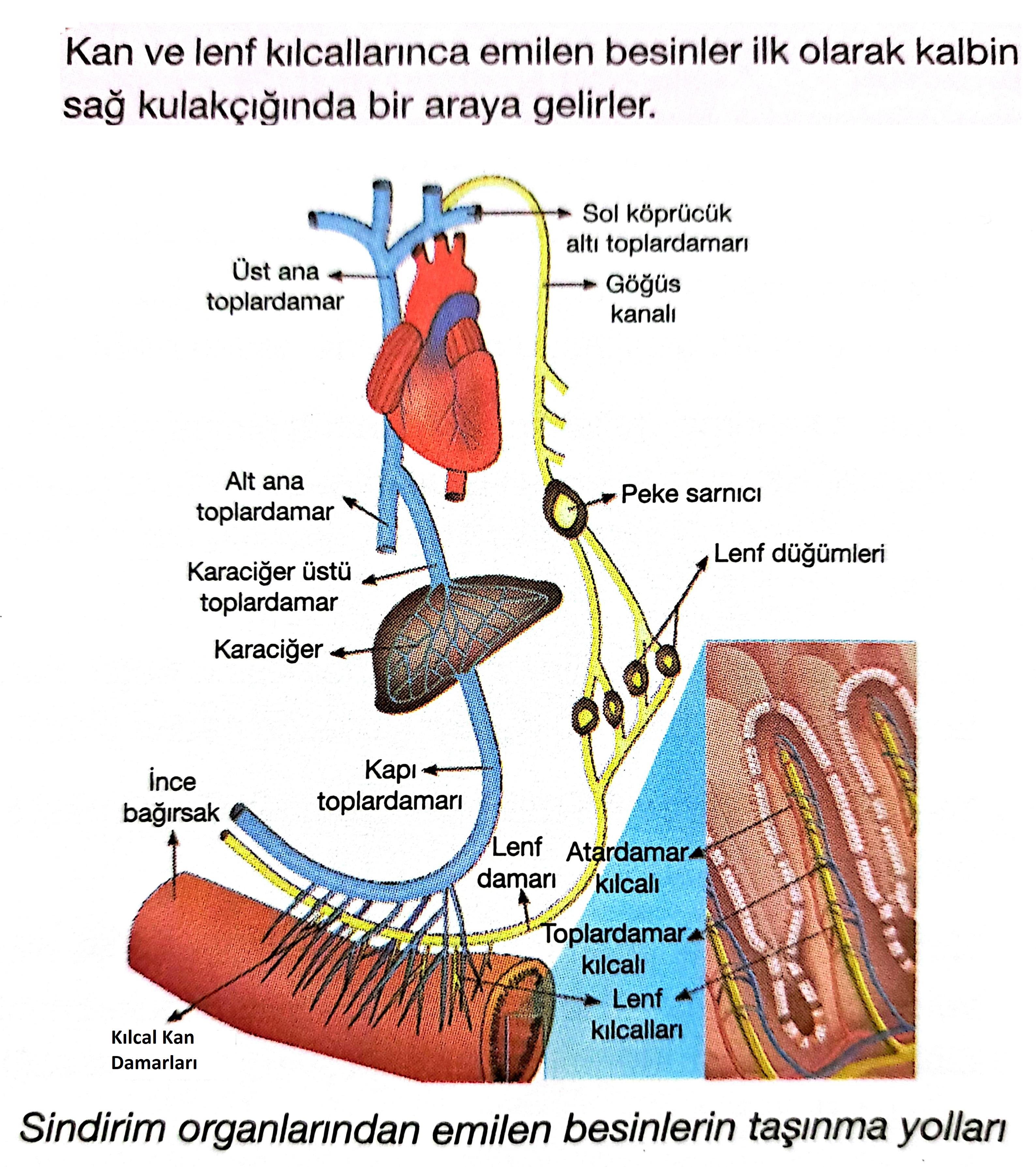 Not: Kan yolu ile karaciğere giden besinler vücudun sağ tarafından, lenf yolu ile kalbe giden besinler ise vücudun sol tarafından ilerleyerek dolaşıma katılır.