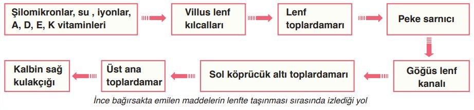 Bazı besinler lenf yolu ile dolaşıma katılır. Bunlar; yağ asidi, gliserol ve yağda çözünen vitaminler (ADEK)'dir. Bu maddeler villuslar ile emilerek bağırsak epiteline alınır. Epitel hücrelerinde yağ asitleri ve gliseroller birleşerek tekrar trigliseritler oluşturulur.