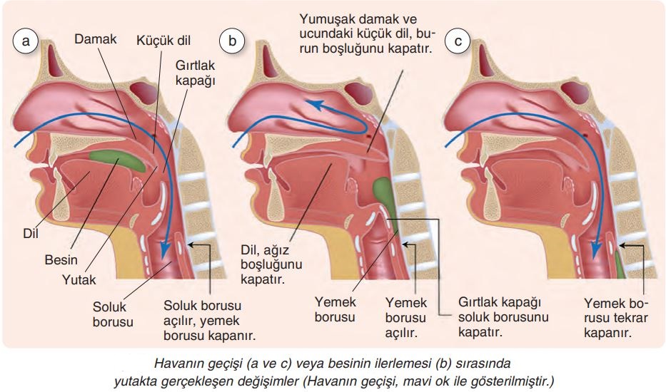 ► Yutkunma sırasında ağızın gerisinde bulunan yumuşak damak (küçük dil); yukarı doğru çekilerek besinin burun boşluklarına kaçmasını önler.