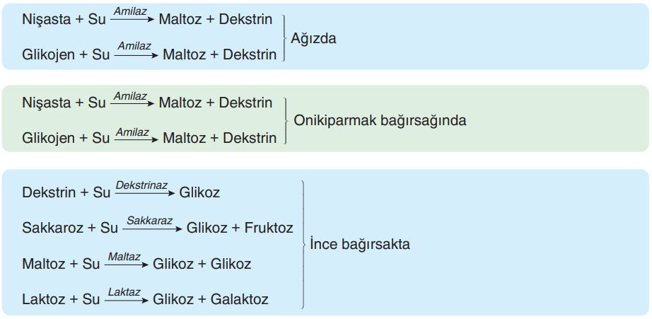 ► İnce bağırsakta üretilen sükraz, laktaz ve maltaz (disakkaridazlar) ise sakkaroz, laktoz ve maltozu yapı birimlerine kadar parçalarlar.