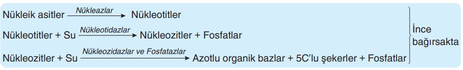 ► Nükleotitleri ise ince bağırsak mukozasından salgılanan nükleotidaz enzimleri ile azotlu organik baz (adenin, guanin, timin ve sitozin), beş karbonlu şeker (riboz veya deoksiriboz) ve fosfat birimlerine kadar parçalanır.