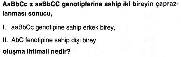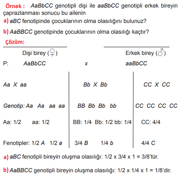 ► Bu formüller 2 bireyin genotipleri farklı ise (Aabb x aaBb) bu tip çaprazlamalarda kullanılmaz. Bu tip durumlarda her bir karakter ayrı ayrı kendi içinde çaprazlanır. İstenilen sonuçlar bulunur. Sonuçlar biraraya getirilerek çarpılır ve birlikte olma olasılıkları bulunur.