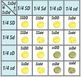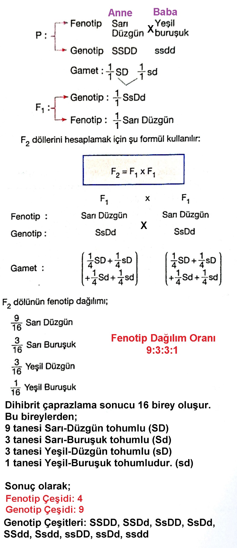 ► İki karakter yönünden zıt özellikte olan iki homozigot bireyin (SSDD x ssdd) çaprazlanması ile tamamı heterozigot, baskın (SsDd) F1 dölleri elde edilir.