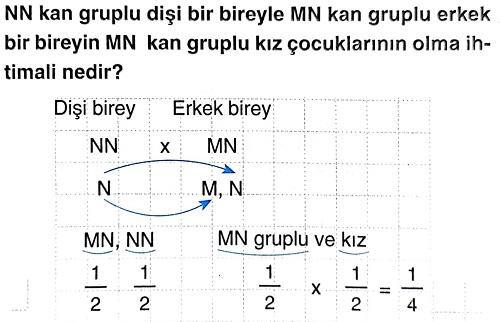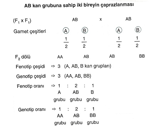 ► Homozigot A ve homozigot B gruplu iki birey çaprazlandığında F1 bireylerinin %100'ü AB kan gruplu olur.