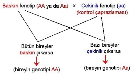 ► Kontrol çaprazlamasıyla genotipi bulunmaya çalışılan birey (AA, Aa genotiplerinden hangisi olduğu) homozigot çekinik birey ile (aa ile) çaprazlanır ve oluşan yavrulara bakılır.