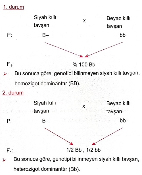 Siyah kıllı tavşanın genotipi: BB ya da Bb olabilir. Bunu öğrenmek için siyah kıllı tavşan homozigot çekinik genotipli (bb) beyaz tüylü bir tavşan ile çaprazlanır. Çaprazlama sonucunda 2 durum ortaya çıkabilir.