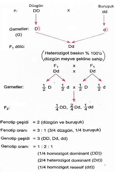 ► Bir karakter yönünden zıt özellikte olan 2 homozigot bireyin (DD x dd) çaprazlanması ile tamamı heterozigot (Dd) F1 dölleri elde edilir.