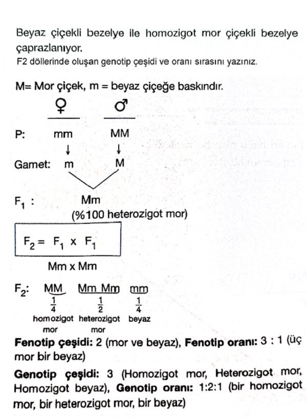 6054Aynı türden kırmızı çiçekli iki bitki arasında yapılan birinci çaprazlama sonucunda 3/4'ü kırmızı çiçekli 1/4'ü beyaz çiçekli olan F1 dölü elde edilmiştir. F1 dölünden alınan kırmızı çiçekli iki bitkiyle yapılan ikinci çaprazlamadan elde edilen F2 dölündeki tüm bitkiler kırmızı çiçekli olmuştur.