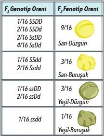 ► Homozigot sarı-düzgün bezelye ile homozigot yeşil-buruşuk tohumlu bezelyenin çaprazlamasında F1 dölünden oluşan bireyler %100 sarı-düzgündür. (Sarı tohum yeşil tohuma, düzgün tohum buruşuk tohuma baskındır.)