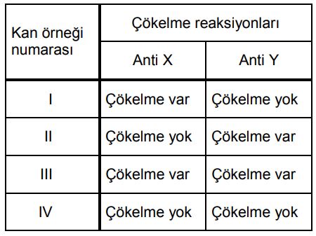 Bir deneyde hangisinin Anti A, hangisinin Anti B olduğu bilinmediği için Anti X ve Anti Y olarak adlandırılan bu maddeler, I, II, III ve IV numaralı kan örneklerine ayrı ayrı uygulanmış ve aşağıdaki tabloda belirtilen çökelme reaksiyonları alınmıştır.