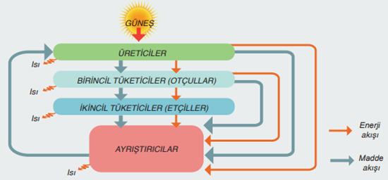 Enerji ekosistemlere Güneş’ten gelir, üreticiler tarafından fotosentezle kimyasal enerjiye dönüştürülür ve besin zinciri boyunca tüketicilere aktarılır. Enerji her trofik basamakta bir kısmı ısı olarak kaybedilir ve bu akış tek yönlüdür; enerji geri dönmez. Buna karşılık, maddeler (su, karbon, azot vb.) ayrıştırıcılar sayesinde tekrar ekosisteme kazandırılarak döngü hâlinde hareket eder.