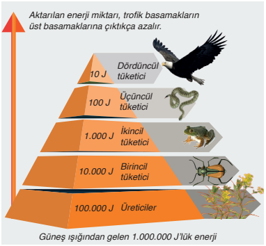 Her trofik basamakta canlılar, aldıkları enerjinin büyük bir kısmını solunum, hareket, ısı üretimi, büyüme ve üreme gibi yaşamsal faaliyetlerinde kullanır ve bu enerji ısı şeklinde ortama yayılır. Bir üst basamağa sadece önceki basamaktaki enerjinin küçük bir kısmı (yaklaşık %10’u) aktarılır. Bu nedenle üreticilerde enerji miktarı en fazla, besin zincirinin üst basamaklarındaki yırtıcılarda ise en azdır.