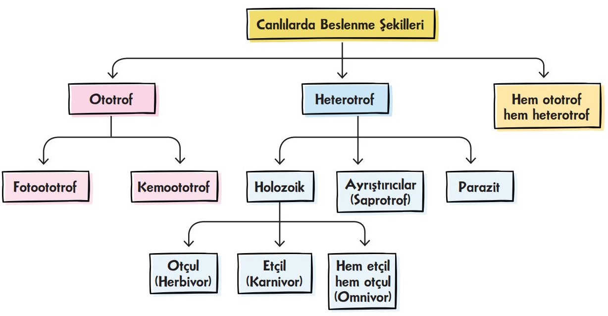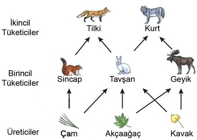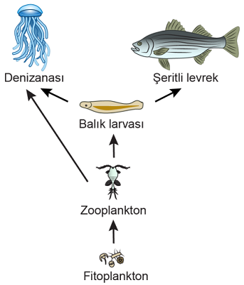 Şemada oklar, besin kaynağı olan gruptan besin alan gruba doğru çizilmiştir.