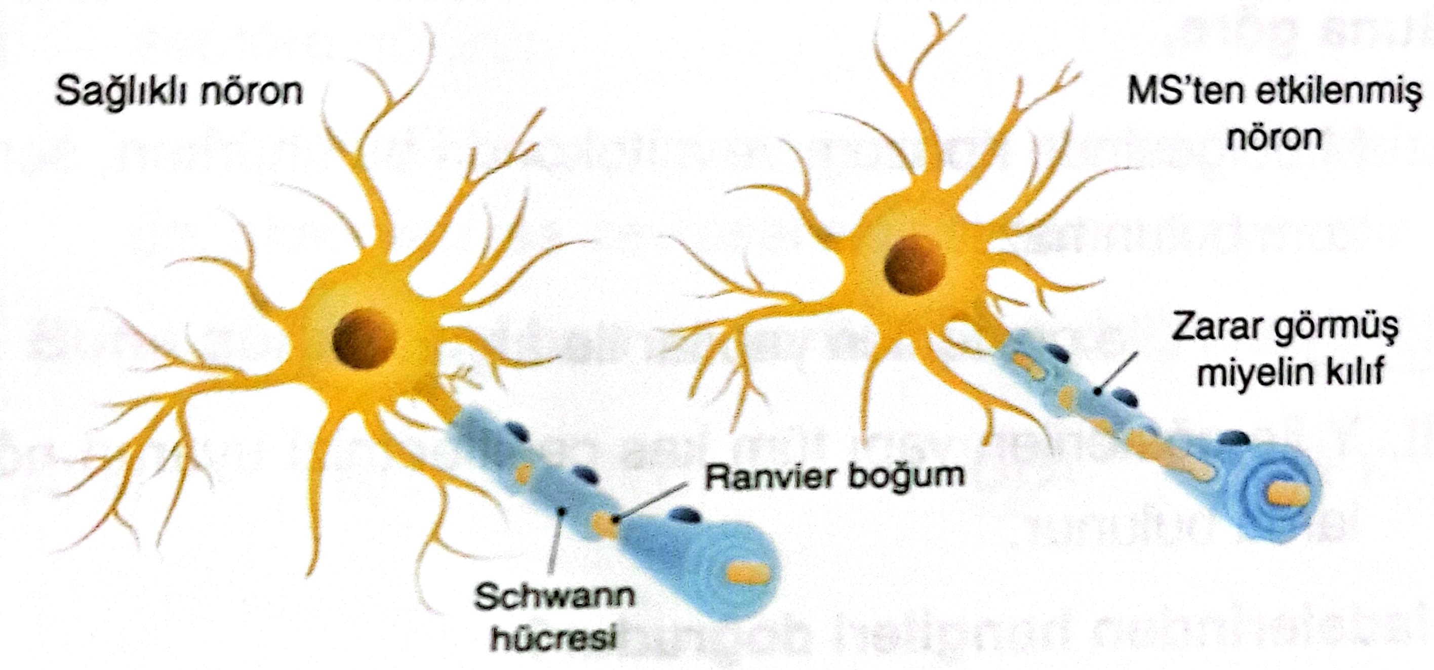Multiple Skleroz (MS), Nöronların aksonlarını kaplayan miyelin kılıfın iltihaplanması veya zarar görmesi durumunda oluşur. Halsizlik, uyuşma, duyu eksikliği, denge bozukluğu, titreme gibi olumsuzluklar görülür.