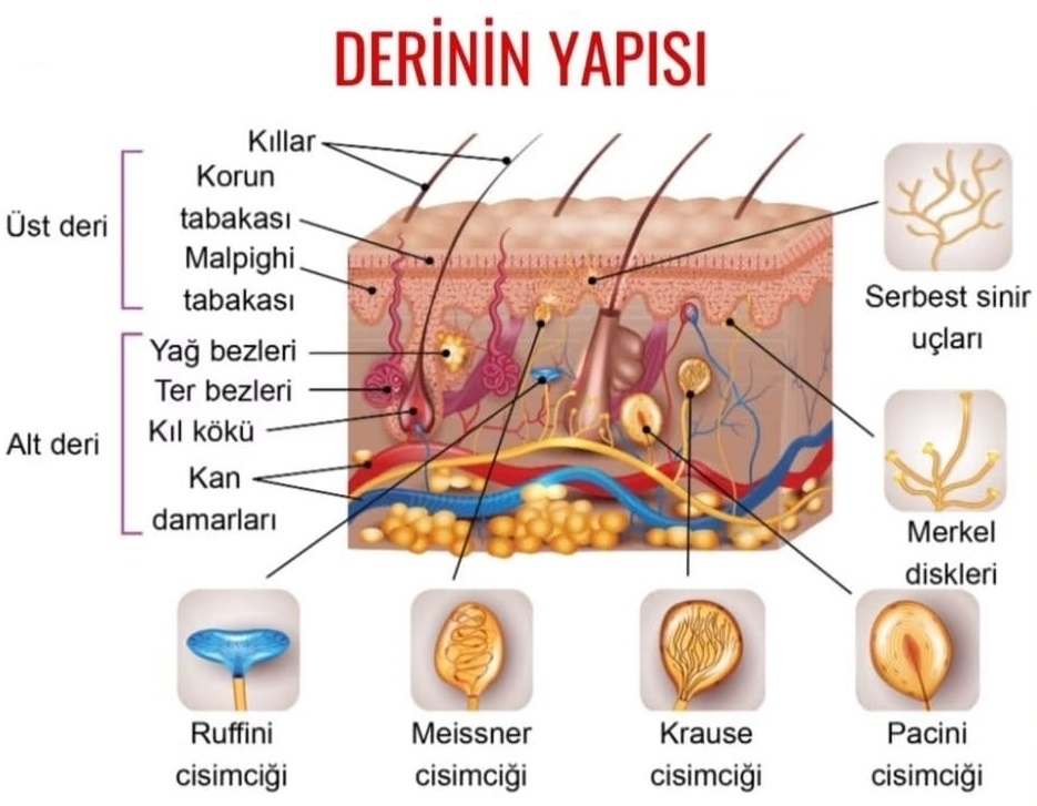 ► Termoreseptörler, Deride bulunan, sıcak ve soğuk gibi uyarıları algılayan reseptörler.