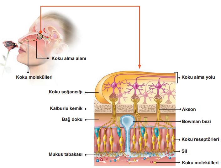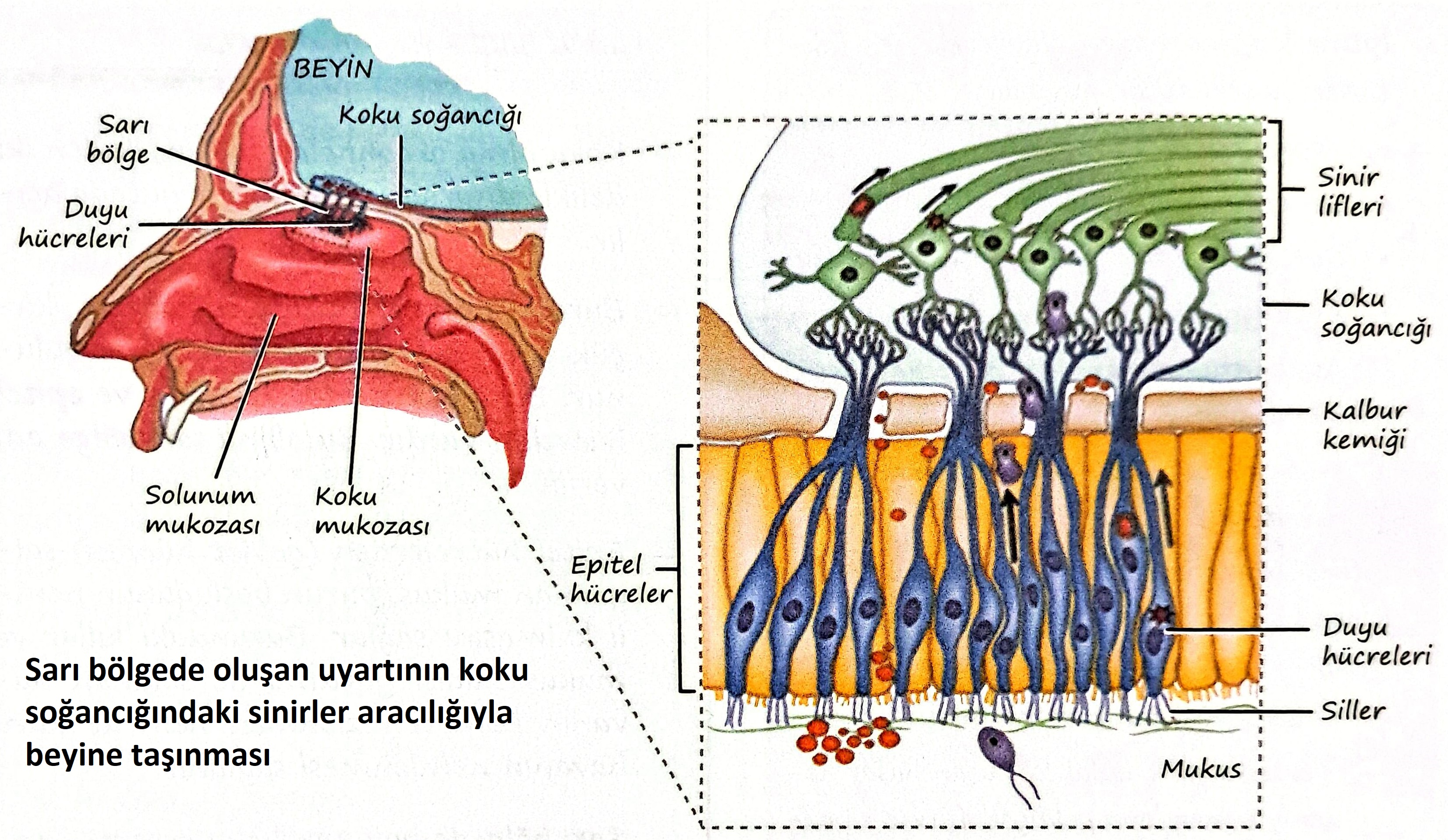 ► Kemoreseptörler, Burun ve dilde bulunur. Kimyasal uyarıları algılar. Susuzluk hissinin oluşmasında görev yapan Ozmoreseptörler iç kimyasal reseptör örneğidir.