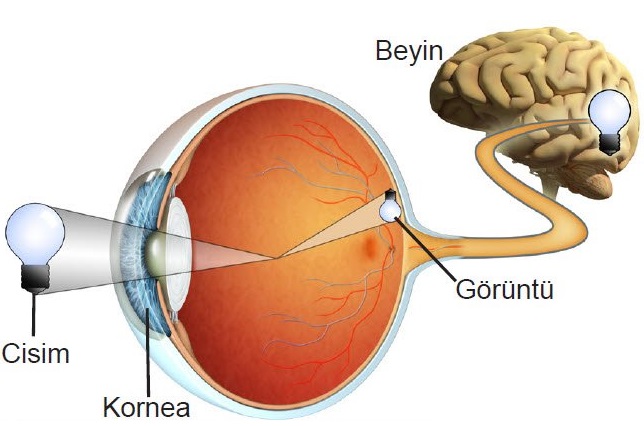 ► Retinaya ulaşan ışınlar sarı benekteki fotoreseptörleri uyarır. Uyarılan reseptörler görme sinirlerinde (duyu nöronları) uyartı (impuls) oluşturur.