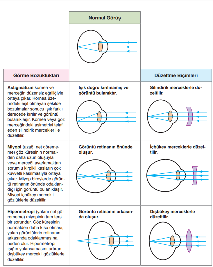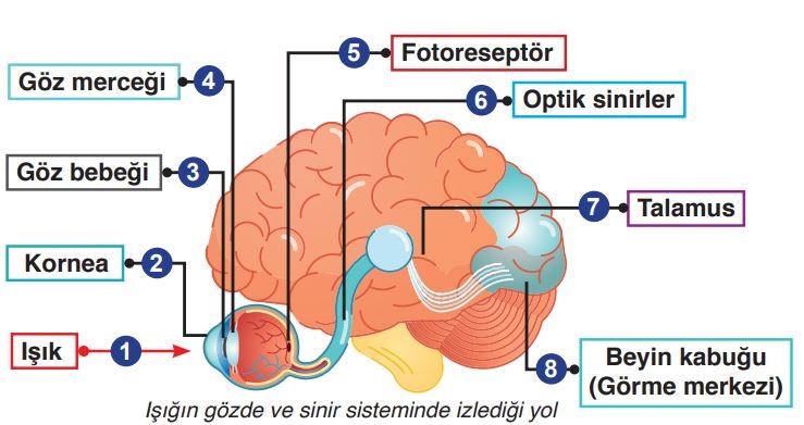 ► Göz, dışarıdan gelen ışığı fotoreseptörler aracılığıyla duyu nöronlarına aktararak impulsa dönüştürür. Oluşan impuls beyindeki ilgili merkezde değerlendirilerek görme olayı gerçekleşir.