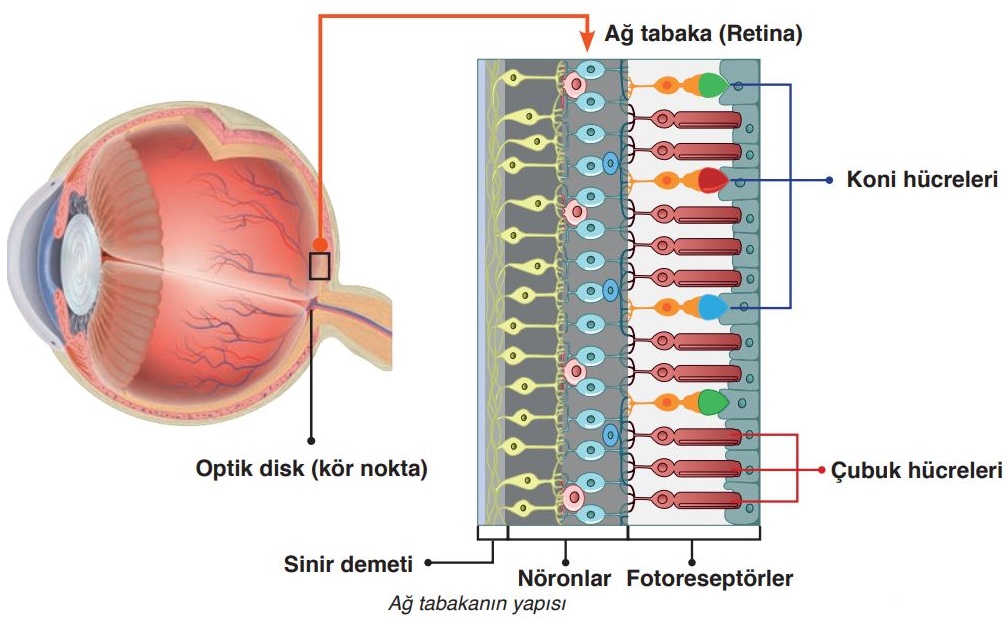 ► Görme sinirlerinin (duyu nöronları) retinadan çıktığı yerde koni ve çubuk hücreleri bulunmadığından ışık burada impuls oluşturmaz. Görme sinirlerinin retinadan çıktığı bu noktaya Kör Nokta (Optik Disk) adı verilir.