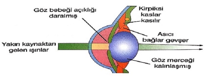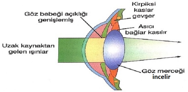 ⇒ Asıcı bağlar kasılır ve göz merceğini çeker.