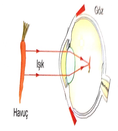 ► Mercekte ikinci kez kırılan ışınlar camsı cisimdeki sıvıdan geçerek retinadaki sarı beneğe ters görüntü olarak düşer. Bunun nedeni ince kenarlı olan göz merceği ışınları kırarken ters çevirir ve retinaya ters ve küçük bir görüntü olarak düşürür.