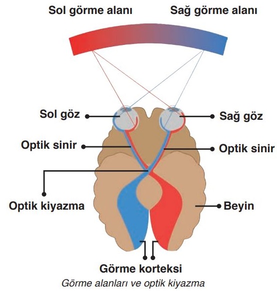 ► Sağ ve sol gözden gelen optik sinirler beyin kabuğunun (uç beyin) tabanında Optik Kiyazma denilen bir yerde karşılaşır. Sol taraftaki görme alanından gelen görüntü beynin sağ tarafına, sağ taraftaki görme alanından gelen görüntü ise beynin sol tarafına iletilir.