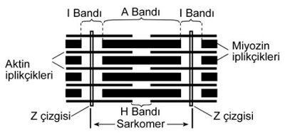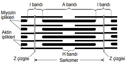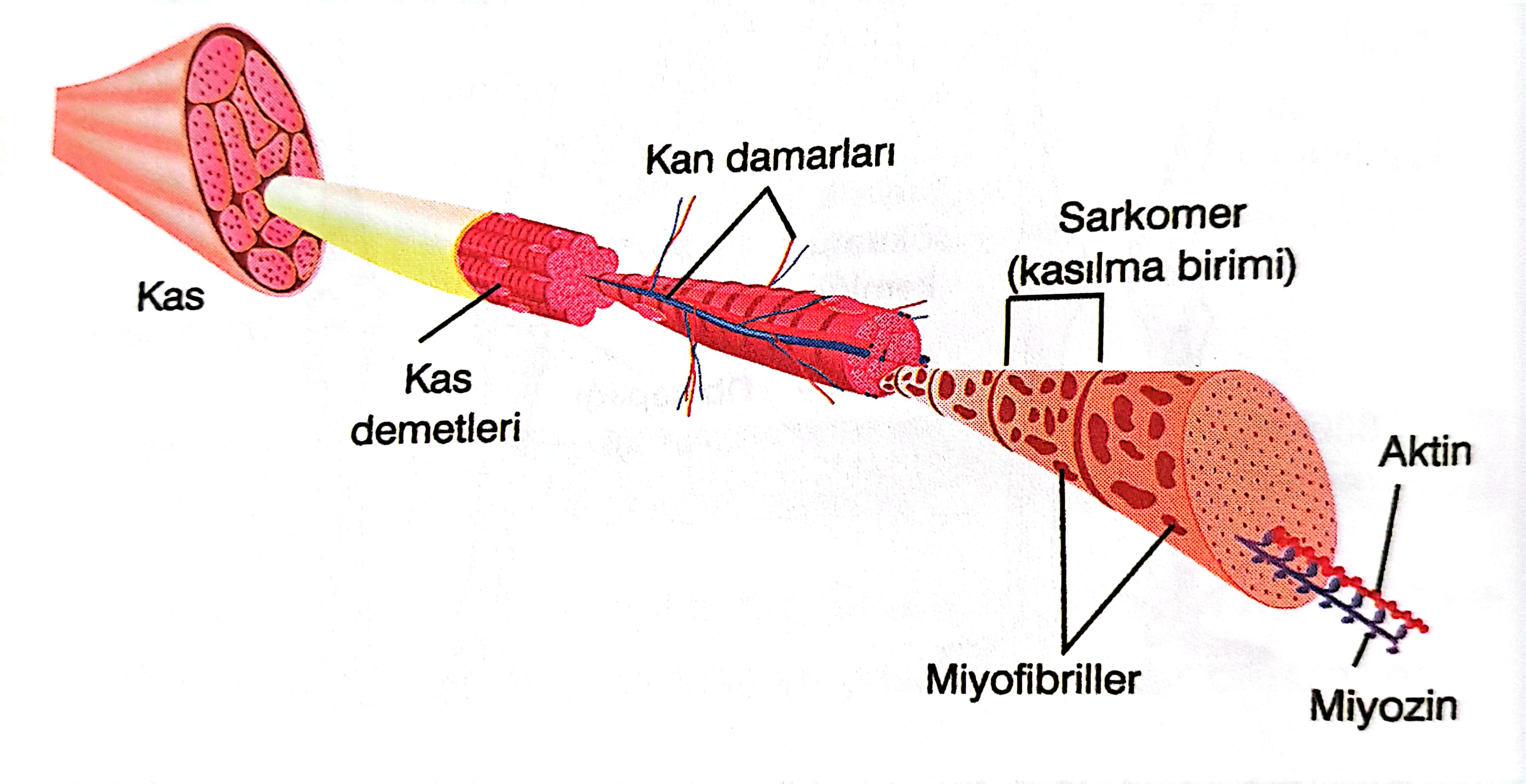 ►İskelet (çizgili) kasın yapısında aktin ve miyozin filamentlerini bulunduran kasılma birimine Sarkomer denir. Kasılma birimi olan Sarkomer; iskelet ve kalp kasında bulunurken, düz kaslarda bulunmaz.