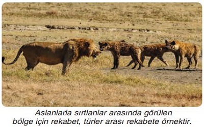 Türler Arası Rekabet: Komünitedeki iki farklı türün aynı kaynakları, aynı zamanda kullanması bu kaynakların miktarında azalmaya neden olursa bu türler arasında rekabet görülür. Aynı bahçe içindeki yabani otlarla bahçe bitkilerinin güneş ışığı, topraktaki su ve mineraller için; aslanlarla sırtlanların yaşamlarını sürdürdükleri bölge (teritori) için, vaşaklarla tilkilerin ise tavşanlar (av) için rekabet etmesi türler arası rekabete örnektir.