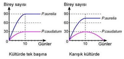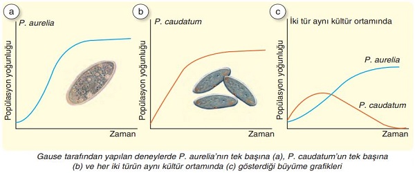 ► Türler arası rekabetin etkileri, 1934 yılında Rus ekolog G. F. Gause (Gaus) tarafından birbiriyle akraba olan iki protista türü Paramecium aurelia (Paramesyum aurelya) ve Paramecium caudatum (Paramesyum kaudatum) ile yapılan deneylerle gösterilmiştir.