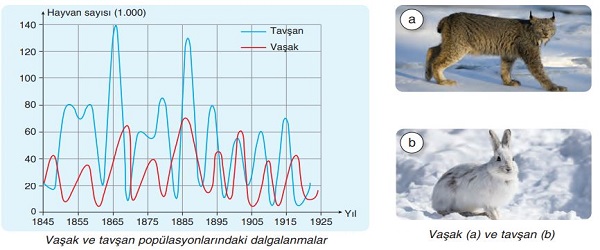 ► Doğada yapılan gözlemlerde tavşanların popülasyondaki birey sayısı arttıkça vaşakların da sayısının arttığı, bunun sonucunda daha fazla avlanılan tavşanların popülasyondaki birey sayısının düşüş göstermesiyle vaşakların da sayısının düştüğü görülmektedir.