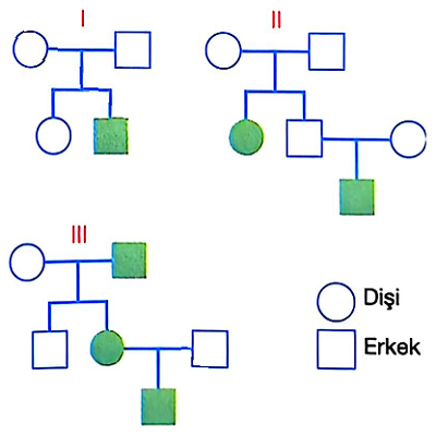Aşağıdaki soyağaçlarının her birinde belirli bir özelliği fenotipinde gösteren bireyler koyu renkte gösterilmiştir.