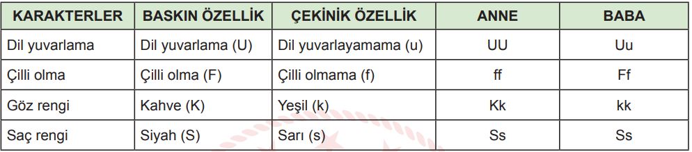 Aşağıdaki tabloda bazı karakterlerin baskın ve çekinik özellik olma durumları ve ebeveynlerin genotipleri verilmiştir.