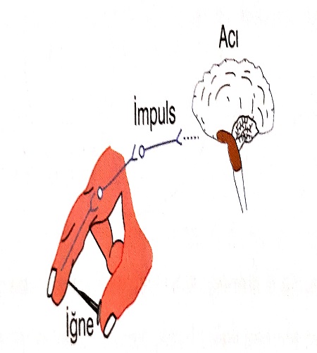 Şekilde vücutta gerçekleşen bir sinirsel aktivite gösterilmiştir. İğne batmasının acısının hissedilmesi sürecinde;