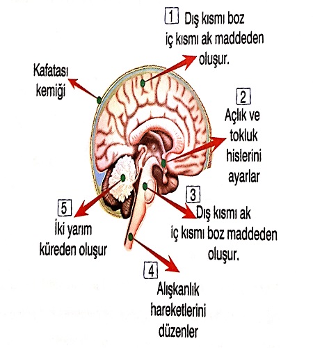 Beynin yapısında bulunan bazı kısımlar şekilde gösterilmiştir.