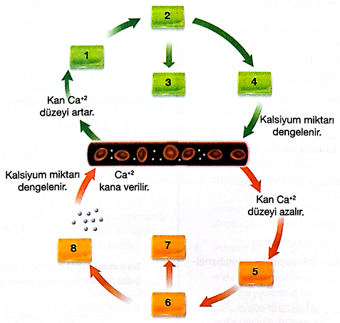 Aşağıda kandaki kalsiyum miktarının dengelenmesi şematize edilmiştir. Şekildeki numaralarla gösterilen yerlerle iigili aşağıdaki boşlukları doldurunuz.