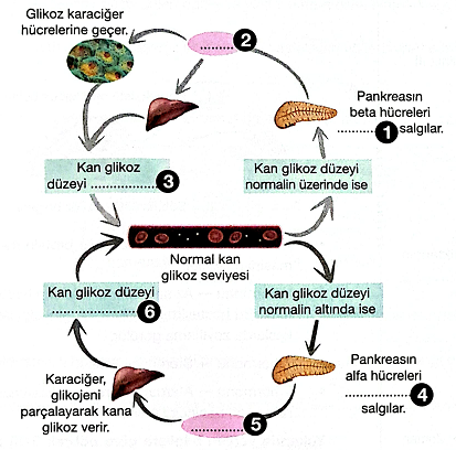 Aşağıda sağlıklı bir insanda kan şekeri oranının dengelenmesinde görevli hormonlar ve organlar gösterilmiştir.