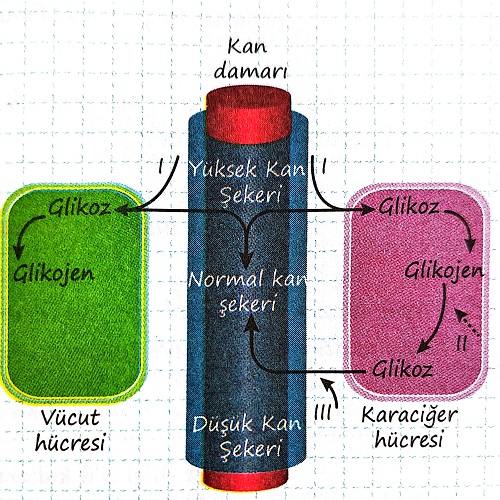 Sağlıklı bir insanda kan şekerinin düzenlenmesini gösteren aşağıdaki şemada belirtilen I, II ve III numaralı hormonların isimlerini ve hangi bezlerden salgılandıklarını yazınız.