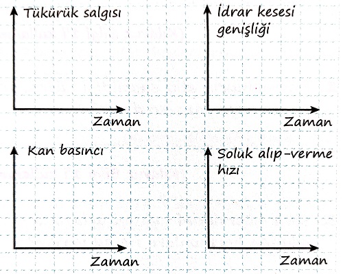 Aniden korkup kaçmaya başlayan bir insanda gözlenebilecek fizyolojik değişimleri ifade eden aşağıdaki grafikleri çiziniz.