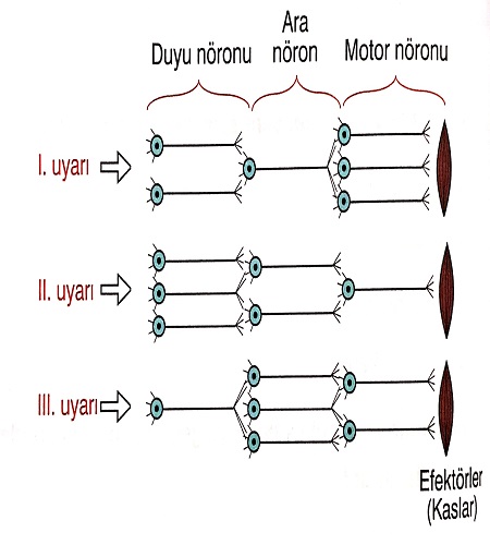 Üç farklı uyartının algılanmasında ve tepki oluşturulmasında etkili olan nöron sayıları şekilde gösterilmiştir. Bu sinir yollarının uyarılan dendrit sayısına göre çoktan aza doğru sıralanması aşağıdakilerden hangisinde verilmiştir? (Her nöronda bir dendrit olduğu kabul edilecektir)