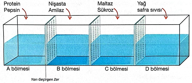 Aşağıdaki kap yarı geçirgen zar ile 4 bölmeye ayrılmıştır. Daha sonra bölgelere gösterilen maddeler eklenip uygun sıcaklık ve pH değerleri sağlandıktan sonra değişimler gözlenmiştir.