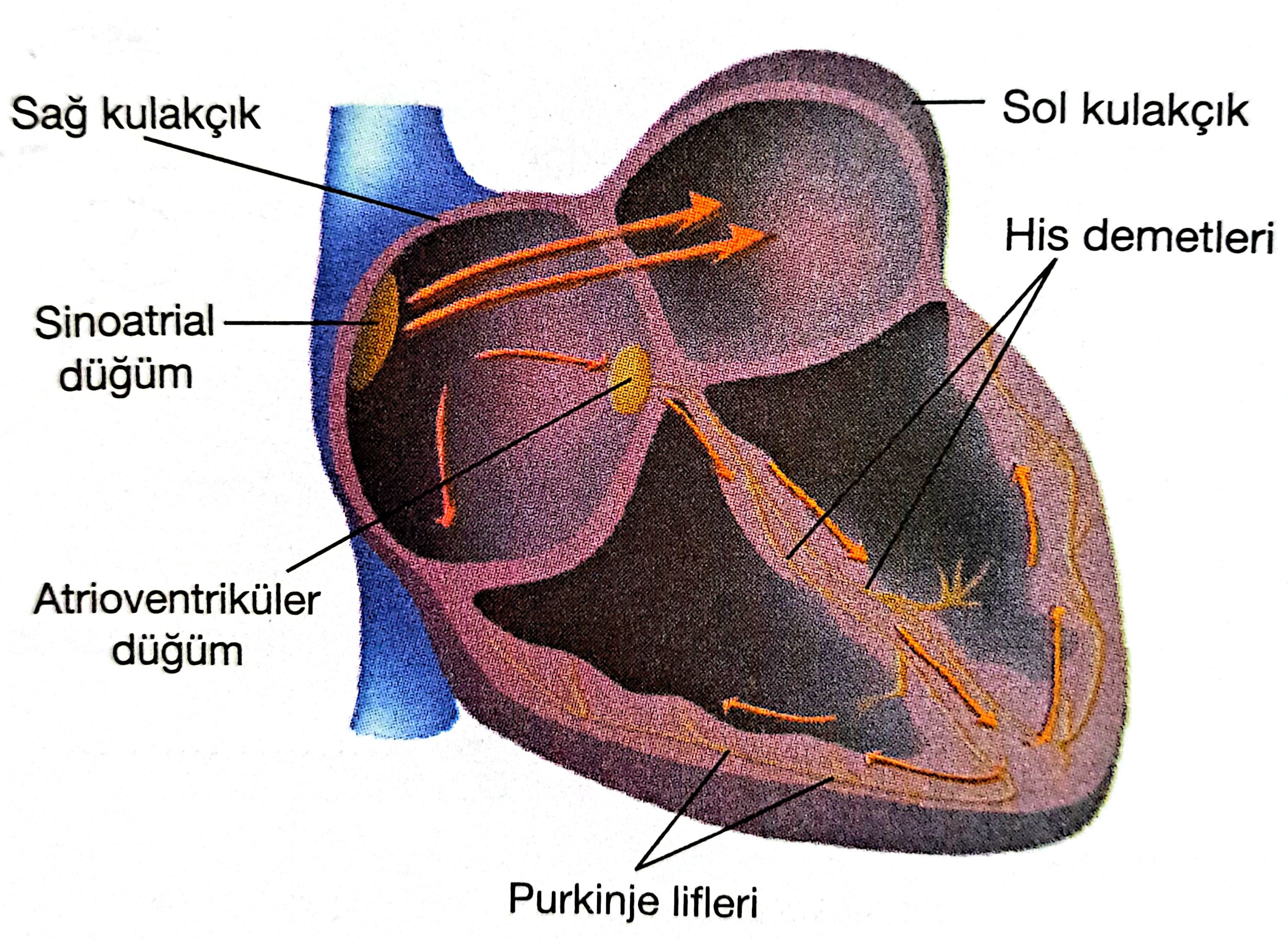 Aşağıdaki şekilde kalbin uyarılması sırasında etkili bazı yapılar gösterilmiştir.