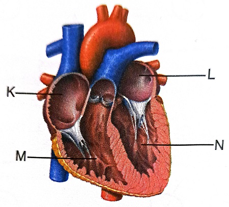 Şekilde gösterilen K, L, M ve N kısımlarından hangileri oksijence zengin (O2 > CO2) kan bulundurur?
