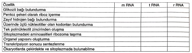 Aşağıdaki tabloda RNA çeşitlerine ait bazı özellikler verilmiştir. Bu özelliklerden mRNA, tRNA ve rRNA'ya ait özellikleri işaretleyiniz.