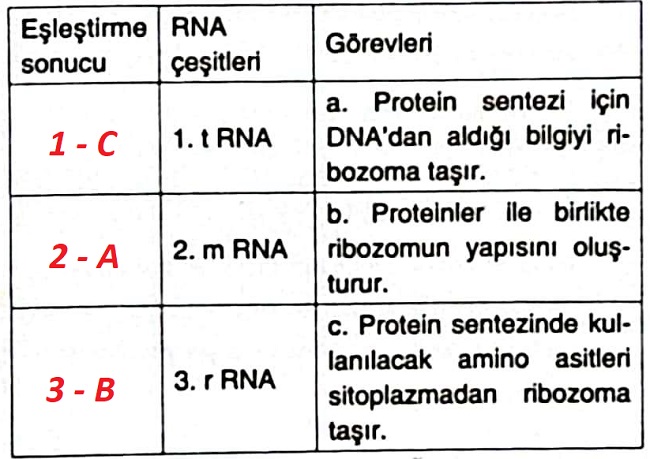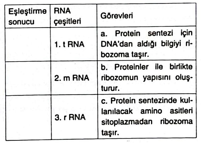 Aşağıdaki tabloda verilen RNA çeşitleri ve görevlerini eşleştirerek "Eşleştirme Sonucu" sütununa yazınız.